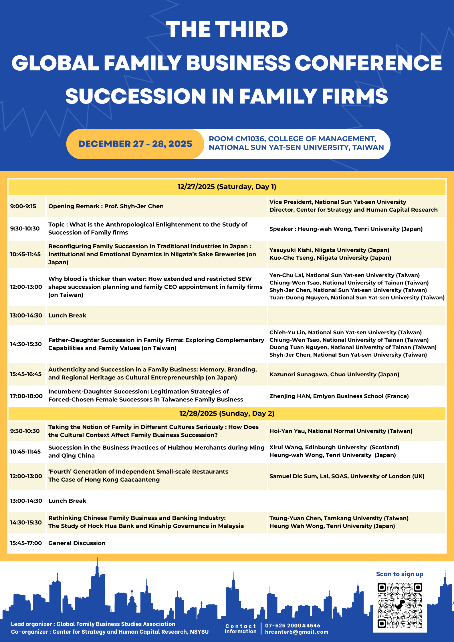 一、本活動為Global Family Business Studies Association主辦,策略與人力資本研究中心協辦,第三屆「Global Family Business Conference」首次移師臺灣,聚焦「家族企業接班(Succession in Family Firms)」,活動邀集來自日本、英國、法國、馬來西亞及臺灣等國學者,內容涵蓋家族企業接班治理、女性接班議題、文化脈絡差異、區域品牌傳承與制度變遷等重要主題,期能促進家族企業研究、治理實務與跨國交流,活動全程將以英語進行。